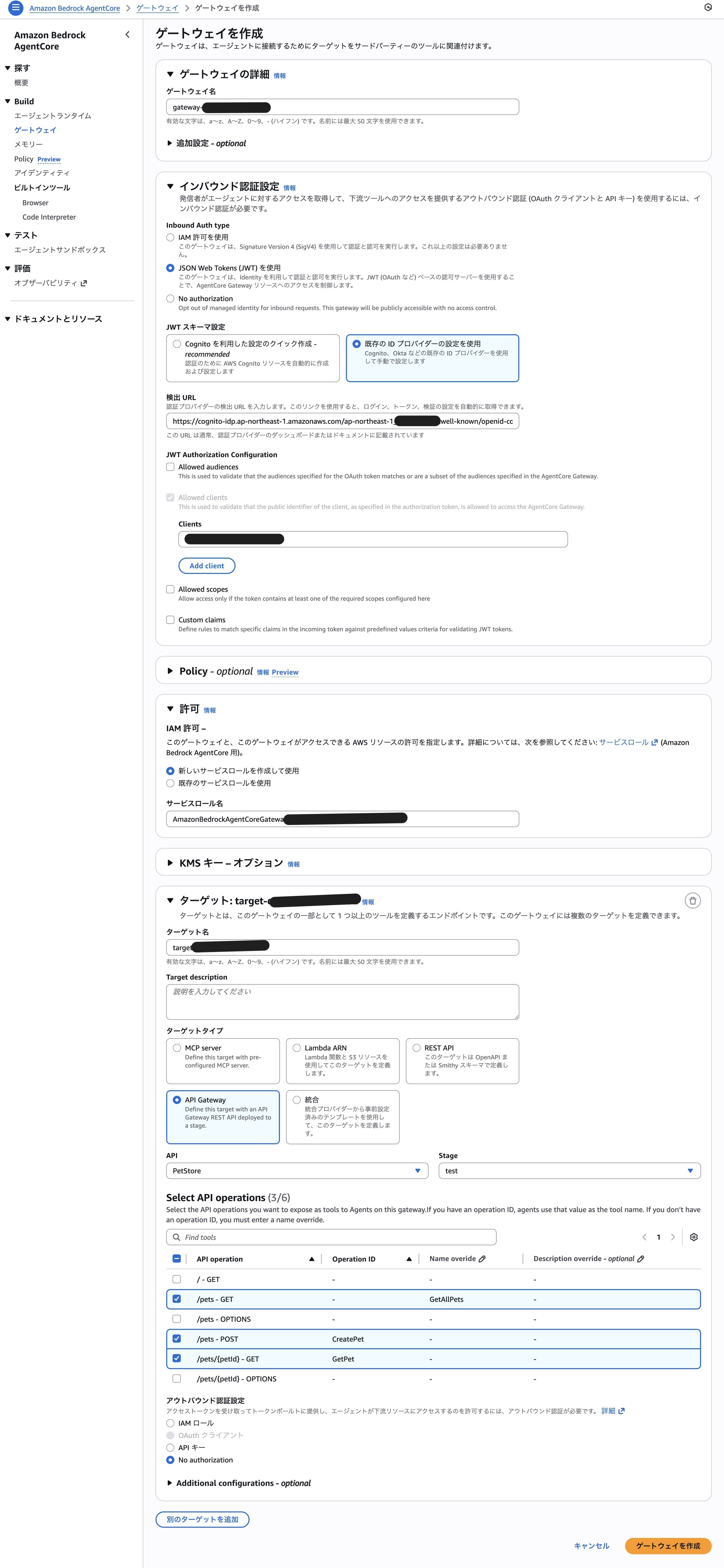 実運用では「IAMロール」を指定して、このAgentCore GatewayがAPI GatewayにアクセスできるようなIAMポリシーを別途指定してあげておくと良い。
