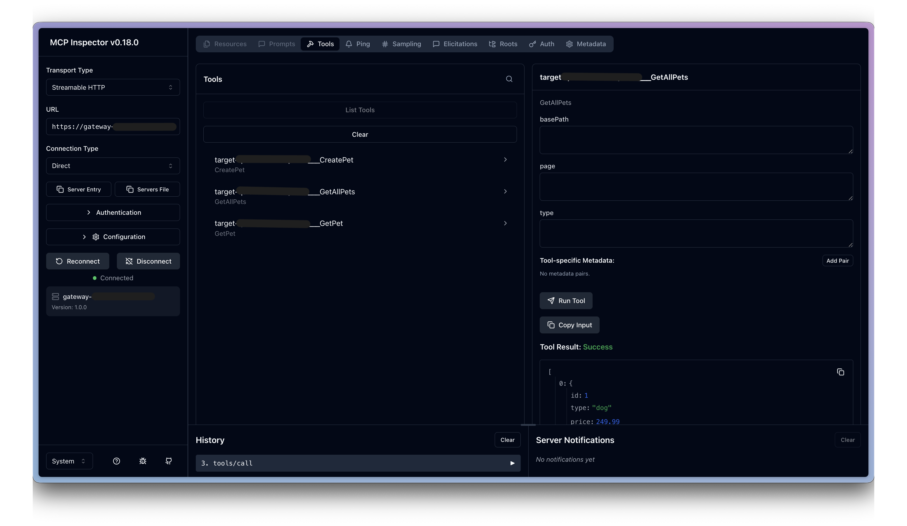 「Tools」タブの「List Tools」でツール一覧を確認でき、そこから各ツールを実際に呼び出すことができる。