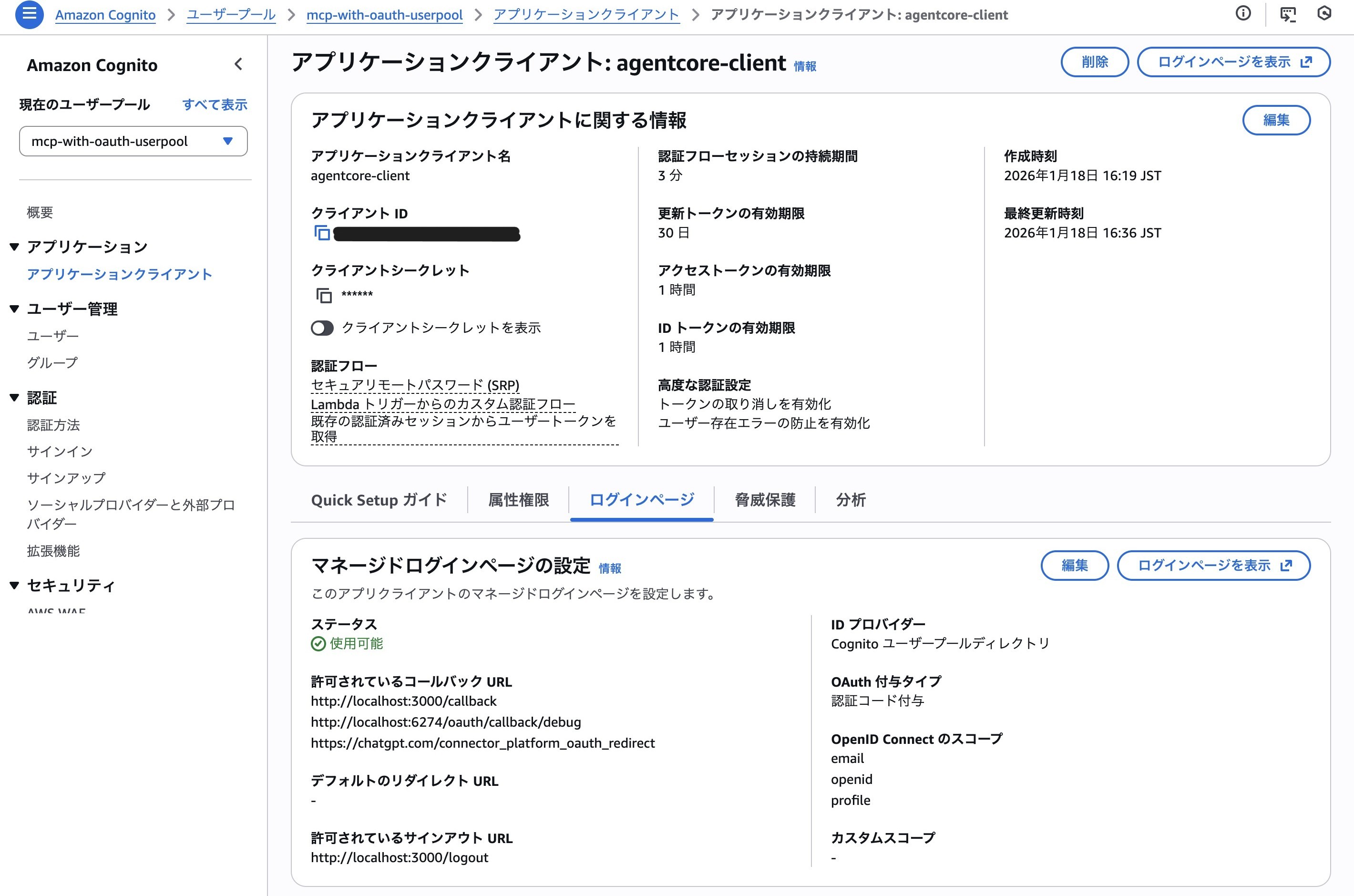 今回は、リモートMCPサーバーをAIエージェントツールに登録する際にCognitoの認証画面を通してユーザー認証を行いたいため、「ログインページ」の設定で、「OAuth付与タイプ」は「認証コード付与」にしておく。