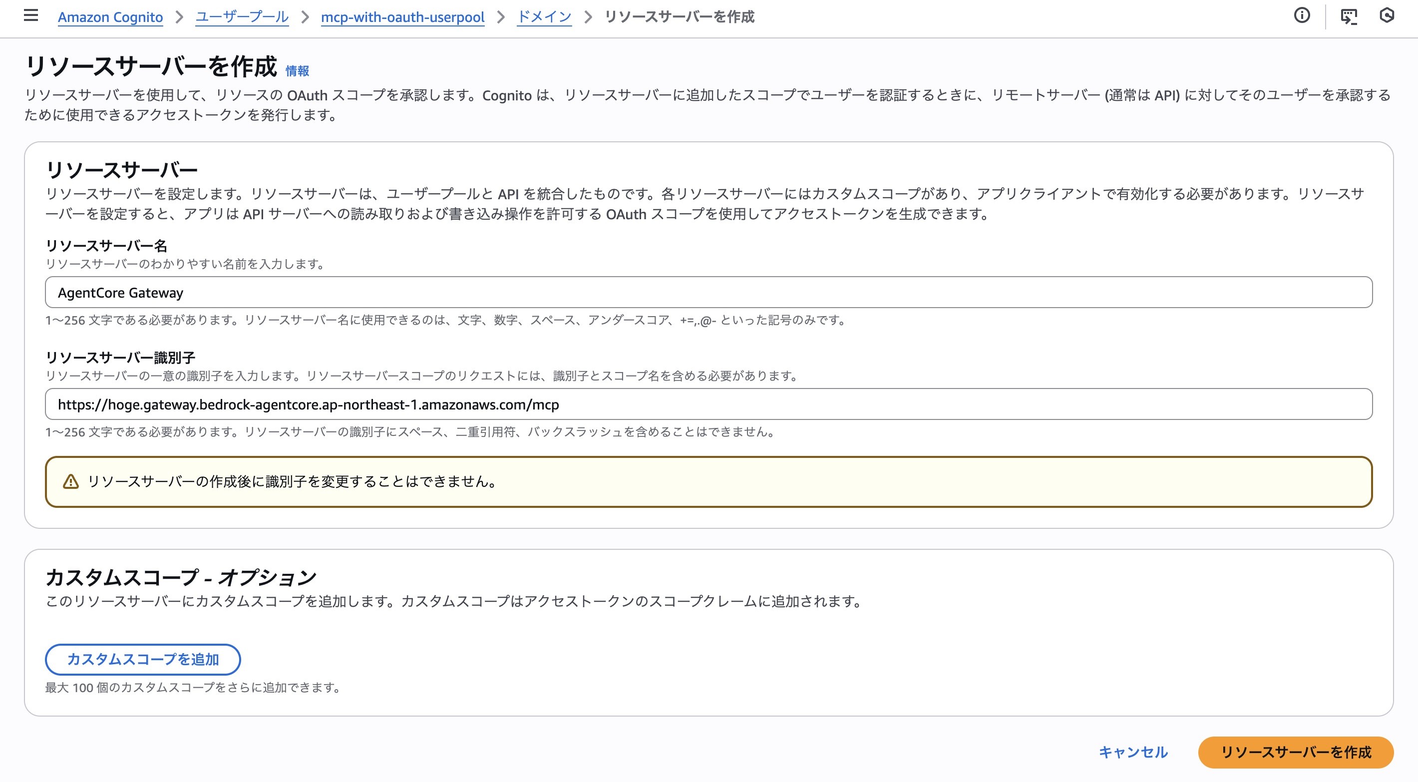 ここで、先ほど作成したAgentCore Gatewayの「ゲートウェイリソースURL」を「リソースサーバー識別子」に入力する。